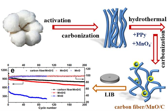 锂离子电池作为一种新能源技术,因其绿色环保、能量密度高等优点在便携式电器、交通运输等方面发挥着越来越重要的作用,电极材料是影响锂离子电池性能的重要因素。生物质如棉花中含有大量的纤维素、木质素、糖等丰富的碳源,将其与MnO复合,利用生物碳材料的微纳结构和优异的电子传导性,可明显改进MnO负极材料的充放电循环性能。基于此,占丹团队从资源的高效循环利用和新能源技术的角度出发,以棉花为原料,利用棉花纤维的独特结构及其中丰富的碳源,提出了一种简便的方法来原位制备碳纤维/MnO/C复合材料。该复合材料在室温下,0.01-3.0V的电压范围内,充放电流密度从0.1逐渐升至3Ag-1,充放60周后材料仍能保持初始容量(1238.5mAhg-1)的35.3%,表现出优秀的高倍率性能和循环稳定性。该成果由我校与桂林电子科技大学、加州大学伯克利分校等多个课题组合作完成,得到了国家自然科学基金(项目编号51708191)和“机电汽车”湖北省优势特色学科群开放基金的支持。