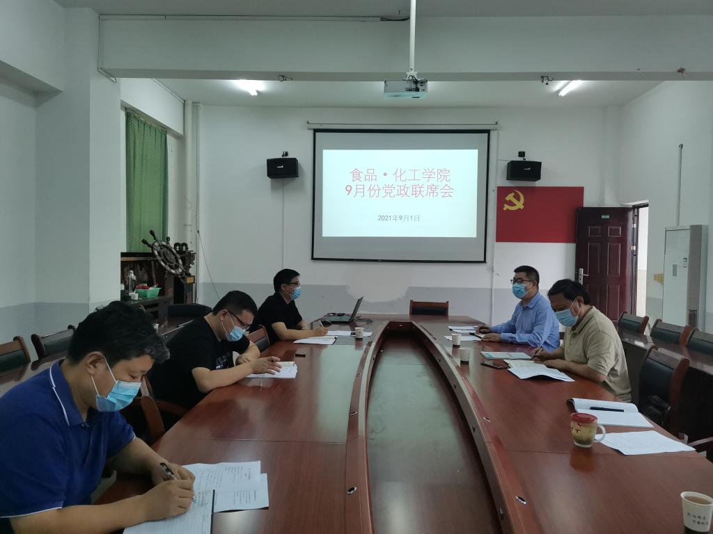 9月1日是新学期开学第一天,上午10:00学院全体班子成员在三楼会议室召开9月份第一次党政联席会。会议对学期初的疫情防控、开学第一课、实验室安全管理等常规工作进行了研究布置,并就博士招聘面试会(化学化工专场)、研究生教育工作、工程教育认证、一流专业申报、学院中层干部队伍建设、教学节暨啤酒文化节筹备、2021级新生(含专升本)化学、生物学课程教学衔接等工作进行了专项研讨。
