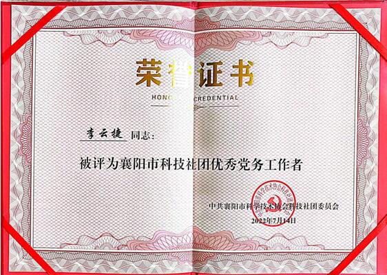 李云捷副教授荣获“襄阳市科技社团优秀党务工作者”称号