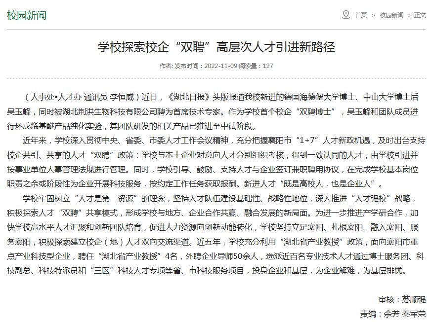 学校报道我院“双聘博士”新机制引进德国海德堡大学吴玉峰博士