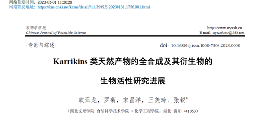 在学生指导工作方面,张锐博士假期以指导老师身份指导化工系本科生2019级(欧亚龙、罗菊)和2020级(宋昌洋、王美玲)撰写的中文综述类文章“Karrikins类天然产物的全合成及其衍生物的生物活性研究进展“经两轮同行评议和主编终审,在农药学领域国产著名期刊《农药学学报》(北大核心期刊&CSCD中国科学引文数据库来源期刊)发表(https://doi.org/10.16801/j.issn.1008-7303.2023.0008)。