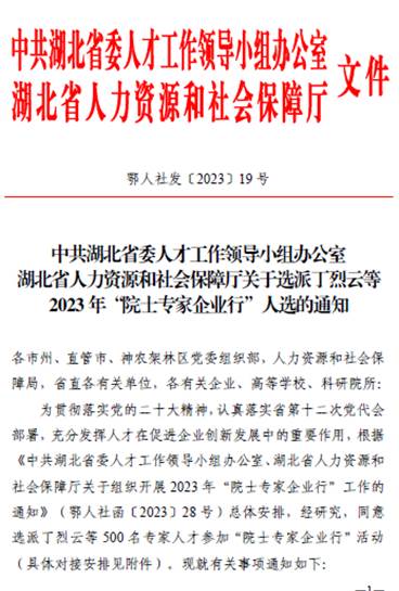 (通讯员 刘向红)日前,中共湖北省委人才工作领导小组办公室、湖北省人力资源和社会保障厅联合发文(鄂人社发[2023] 19号),公布了2023年度“院士专家企业行”专家名单。此次学校共有9位教师成功入选,其中包括我院5位博士教授。