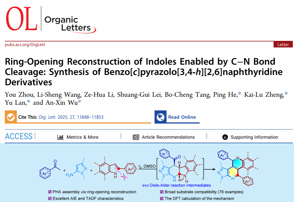 本研究工作是基于华中师范大学吴安心教授课题组深耕20余年所开发的 “I2-DMSO组合试剂系统”作为研究基础,实现基于吲哚C-N键裂解开环的骨架编辑反应,构建苯并萘啶类多环杂芳烃衍生物,同时对其反应机理和光物理性质展开了深入研究。该工作一经发表,便受到了x-mol资讯平台和CBG资讯平台的关注和亮点推介,同时对该研究工作进行了详细的解读,体现出该工作引起了广泛的关注和良好的学术价值。 论文信息:https://pubs.acs.org/doi/10.1021/acs.orglett.5c03710 审核:和平