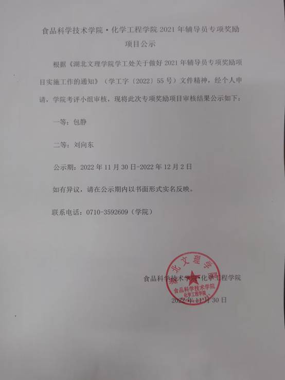 食品科学技术学院•化学工程学院2021年辅导员专项奖励项目公示