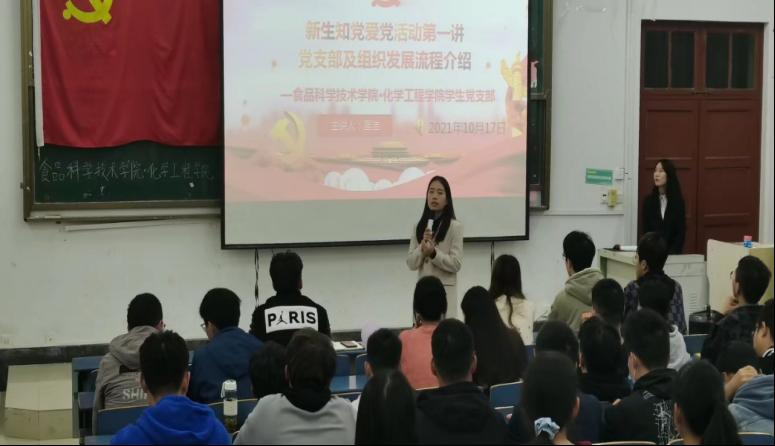 通讯员 李晓诚)为加强学院学生对中国共产党的认识,10月18日18:30,食品·化工学院食品支部在N8-A506开展“知党爱党”主题教育第一讲。院团委书记包静、团委副书记匡洁和21级食品班学生参会,本次宣讲由匡洁主讲。