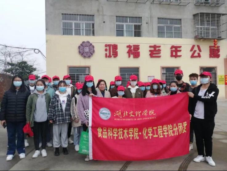 (食化工学院 通讯员 包静阳春三月,春意盎然。为践行雷锋精神,弘扬尊老、爱老、敬老、助老的中华民族传统美德,加强当代大学生思想品德教育,增强大学生的社会责任感。3月16日上午9点,院学工办主任姚继平、团委书记包静带领我院30余名志愿者在襄阳市凤凰村鸿福养老公寓开展了以“送温暖 献爱心 关爱老人从我做起”为主题的志愿服务活动。