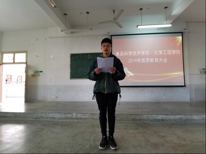 (食品·化工学院 通讯员 张婷)  12月26日下午,食品科学技术学院•化学工程学院举行“2019年感恩教育大会”。参加本次会议的有食化学院党委书记杨豪良、党委副书记刘向东、院学工办主任姚继平、院团委书记刘双圆以及全获得院助学金学生100余人。
