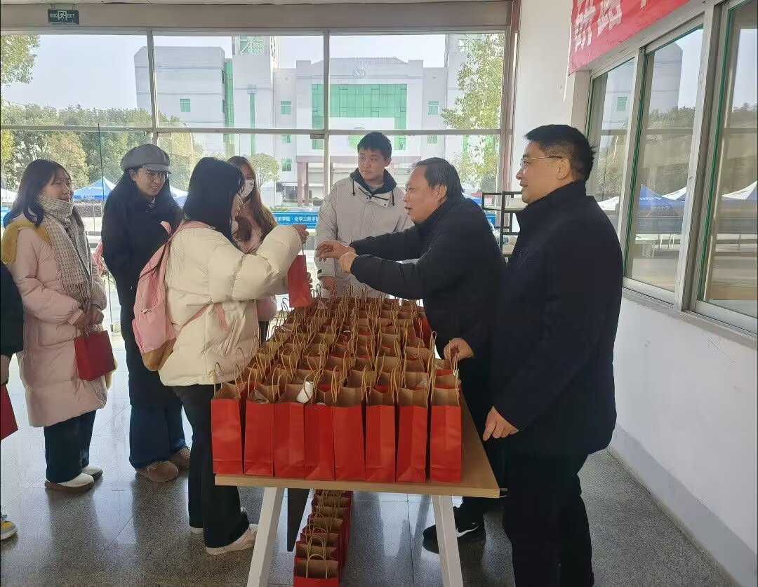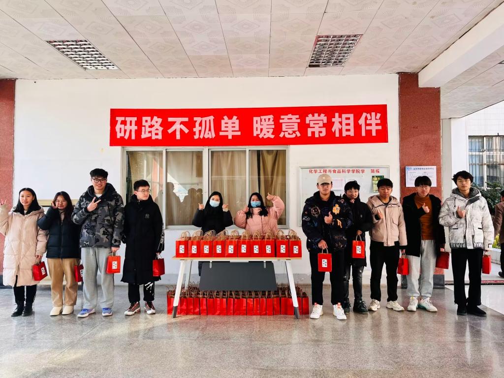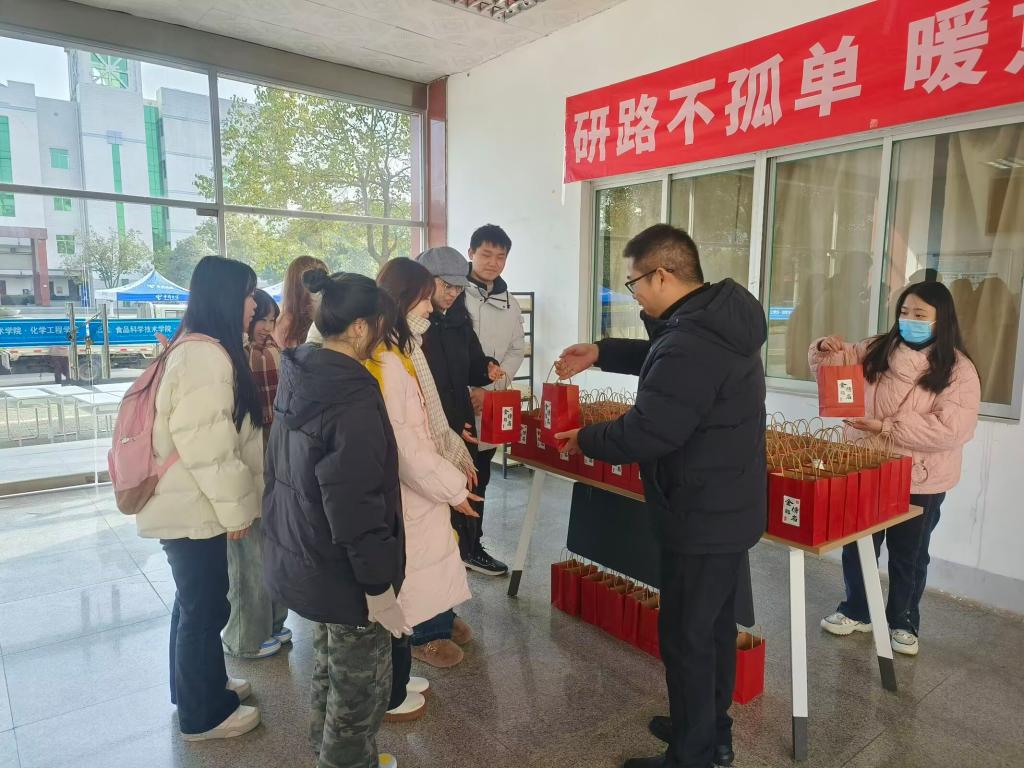 (食品·化工学院 通讯员 华雨)为帮助考研学子缓解备考压力,坚定考研信心,积极冲刺迎考,12月21日上午,食品·化工学院于N3教学楼举办以“研路不孤单,暖意常相伴”为主题的考研送温暖活动,食品·化工学院党委书记杨豪良、执行院长余海忠、党委副书记刘向东、学工办主任包静、辅导员向琼和学生会成员一起为正在备战研究生考试的大四学子送上精心准备的考研暖心加油包。