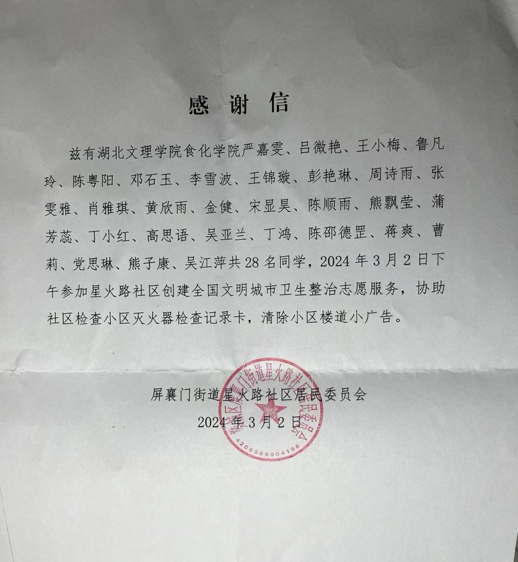 (通讯员 谢多)为提高大学生的环保意识,树立大学生的劳动责任感。2024年3月2日14:00,食品·化工学院学生分团委“食化实说”志愿服务团队组织志愿者前往星火路社区进行“清扫星火路社区”活动。