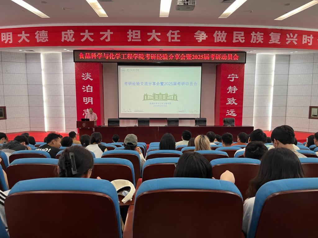 (通讯员 周武毅)为推动学院学生高质量就业,帮助学生树立考研信心,2024年5月23日18时,学院在图书馆三楼报告厅召开2024年考研分享会暨2025届考研动员会,学院党委书记储杰、副书记刘志新、副院长李玉奇、党委委员郭壮、教学委员会主任肖作安、食品系主任李云捷、化工系主任侯秋飞、学工办主任包静、分团委书记向琼、辅导员周武毅、中信鸿图培训机构负责人张鹏、2024届考研学生代表、2025届全体学生参加会议。会议由刘志新主持。