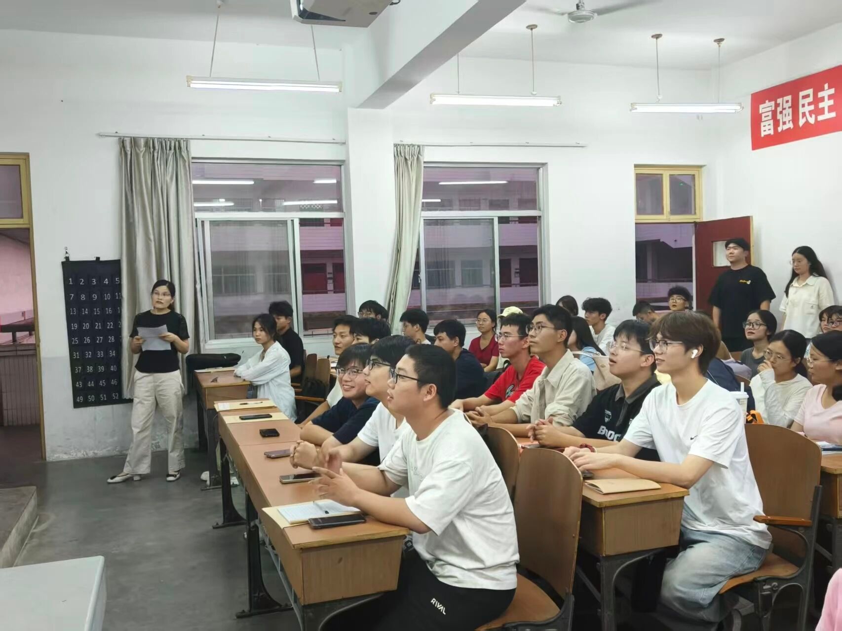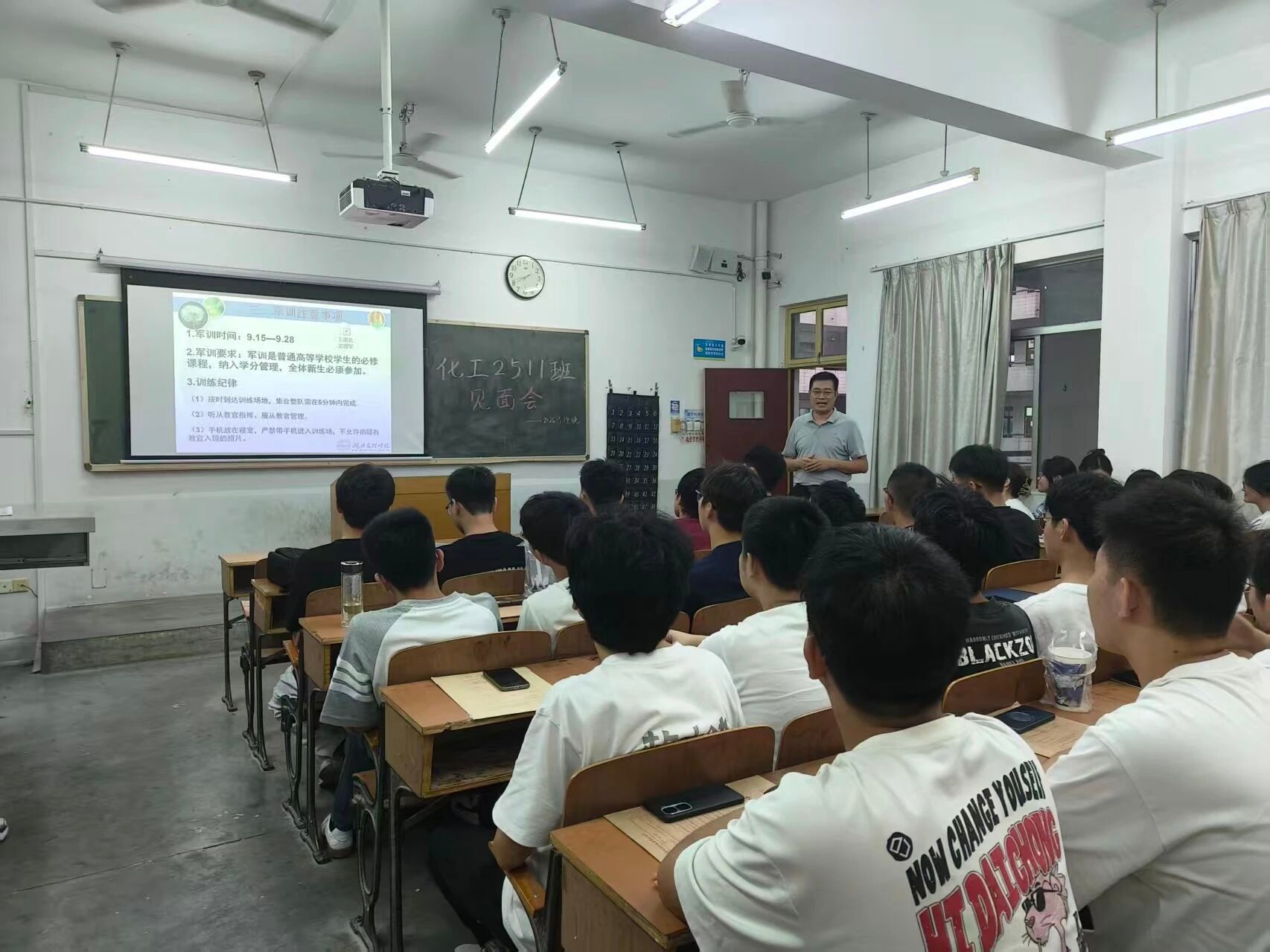 各班主任精心筹备,细致讲解军训着装规范、集合时间、安全防护及应急处理等关键事项,同时组织新生自我介绍,帮助学子快速熟悉彼此。其中,化工2511班班会尤为动人——班主任汪万强腿部受伤,仍拄着拐杖坚持到场。他全程站立讲台,逐字梳理注意事项,从防晒用品选择、训练间隙补水技巧到身体不适报告流程,细节反复强调,还分享实用经验。首次正式与学生见面,他坚持站立着交流,这份真诚而坚定的姿态,让学生们深感触动。 其他班级班会亦亮点纷呈,有的借互动小游戏拉近距离,有的用案例强化安全意识。新生们积极分享家乡特色、兴趣与规划,陌生感在互动中消散,班级凝聚力悄然形成。